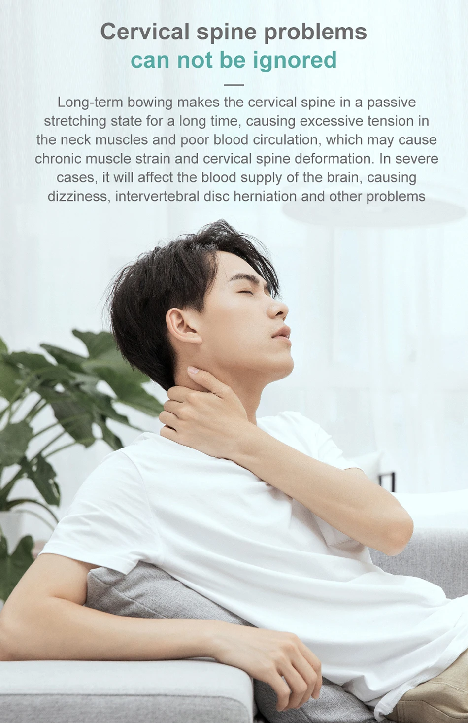 Modern life involves too much long-term sitting and leaning over desks and computers, leading to passive stretching of the neck for prolonged periods. This can build excessive tension on the surrounding muscles, leading to poor circulation, chronic muscle strain, and even deformation of the spine. In severe cases, chronic stress on the cervical vertebrae can affect blood’s flow to the brain, leading to dizziness and – in the worst cases – heightened risk of stroke.